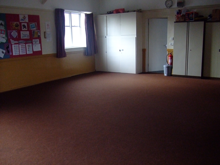 This is the smaller hall measuring 8.5 metres by 6.2 metres. It has carpet and curtains and is equipped with a projector screen for presentations and a piano. It will accommodate 50 sitting in rows. There is access to the kitchen and the carpark off Luccombe Road.